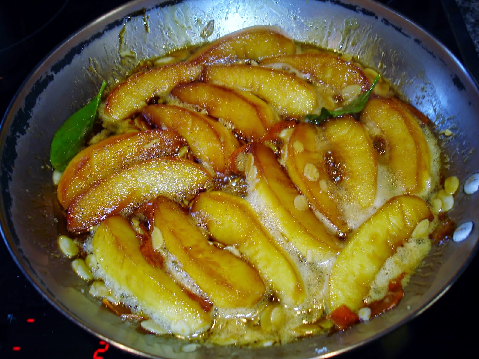 Descasque ao maças corte em quartos e regue com sumo de limão para não escurecerem .Leve ao lume uma frigideira que possa ir ao forno e coloque o açúcar,quando começar a ficar dourado coloque a manteiga em pedacinhos ( cuidado para não queimar demasiado o açúcar para não ficar muito amargo ) deixe envolver ,retire as sementes da vagem de baunilha e acrescente ao caramelo assim como a vagem ,a casca cortada em tirinhas da meia laranja depois coloque as maças e deixe cozinhar um pouco para evaporar a água das mesmas durante aproximadamente 5 minutos ,deite as amêndoas e retire do lume ,deixe arrefecer um pouco ,ligue o forno a 200 cº.